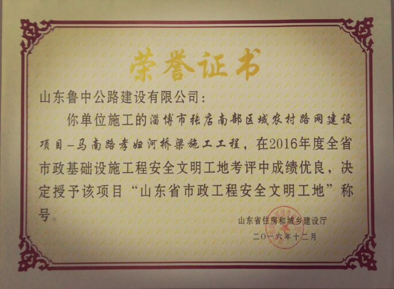 1月3日,經(jīng)確認,由我山東魯中公路建設(shè)有限公司承建的“淄博市張店南部區(qū)域農(nóng)村路網(wǎng)建設(shè)項目—馬南路孝婦河橋梁工程項目”被山東省住房和城鄉(xiāng)建設(shè)廳授予“山東省市政工程安全文明工地”榮譽稱號,在新年伊始便迎來了2017年的開門紅。