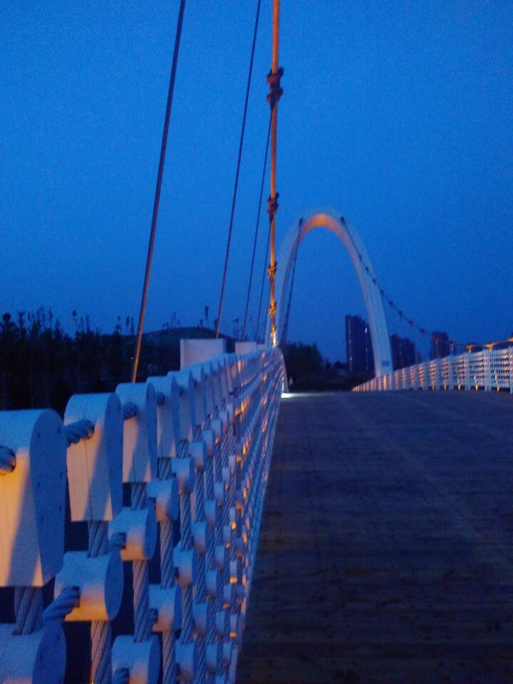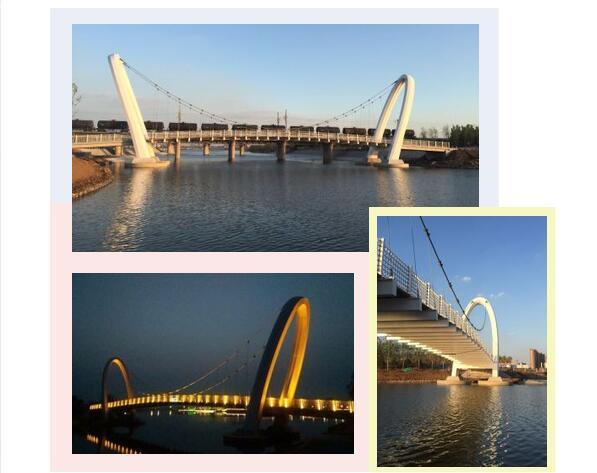 美麗的孝婦河濕地公園內(nèi)矗立著一座雄偉的白色懸索橋,它緊鄰膠濟(jì)鐵路客貨雙線橋,橫跨孝婦河?xùn)|西兩岸,遠(yuǎn)遠(yuǎn)望去猶如一條鋼鐵巨龍?jiān)陉柟庀蚂陟谏x。陽光下,碧波蕩漾,懸索橋意氣風(fēng)發(fā)盤踞在水波之中;夜空中,星輝閃耀,懸索橋潔白如玉與銀河相互輝映。這就是由我山東魯中公路建設(shè)有限公司所承建的淄博市第一座鋼結(jié)構(gòu)懸索橋。