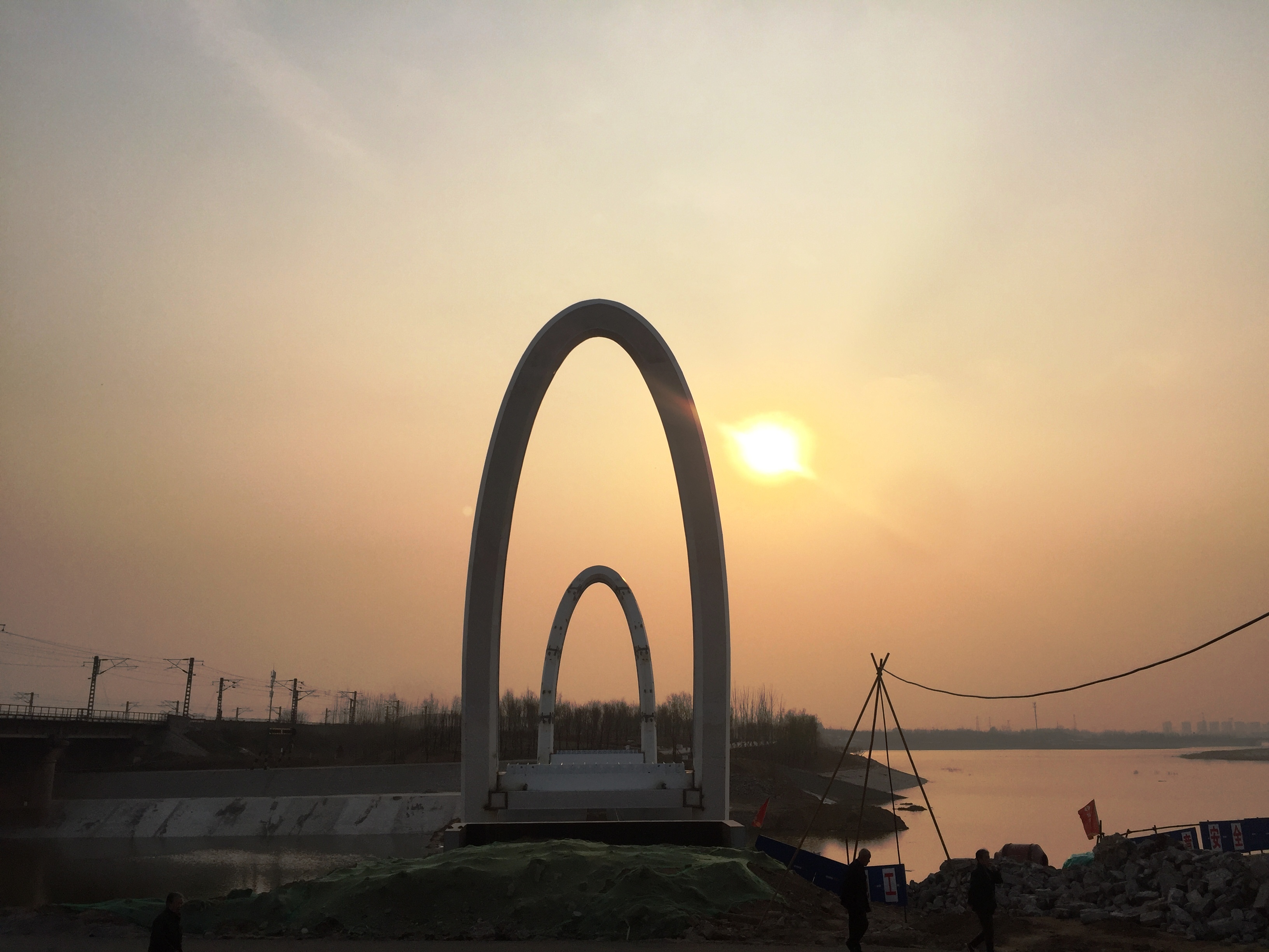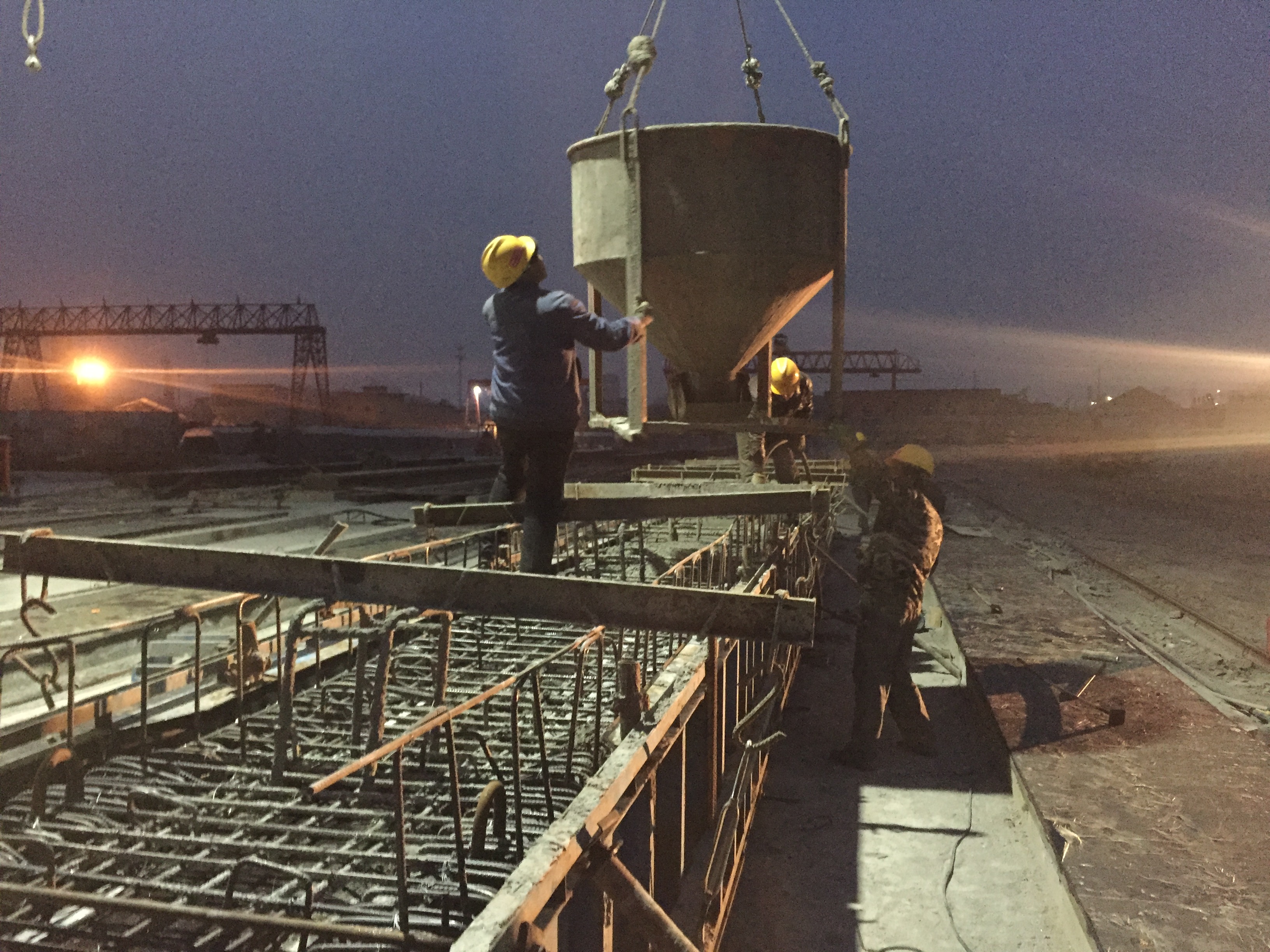 2017年4月22日,晨曦中引梁橋板開始吊裝。