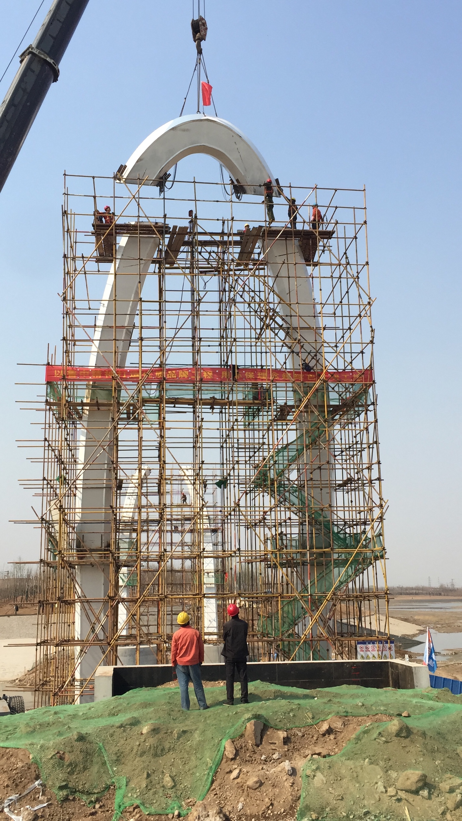 2017年2月28日,鋼主塔施工搭設(shè)腳手架。