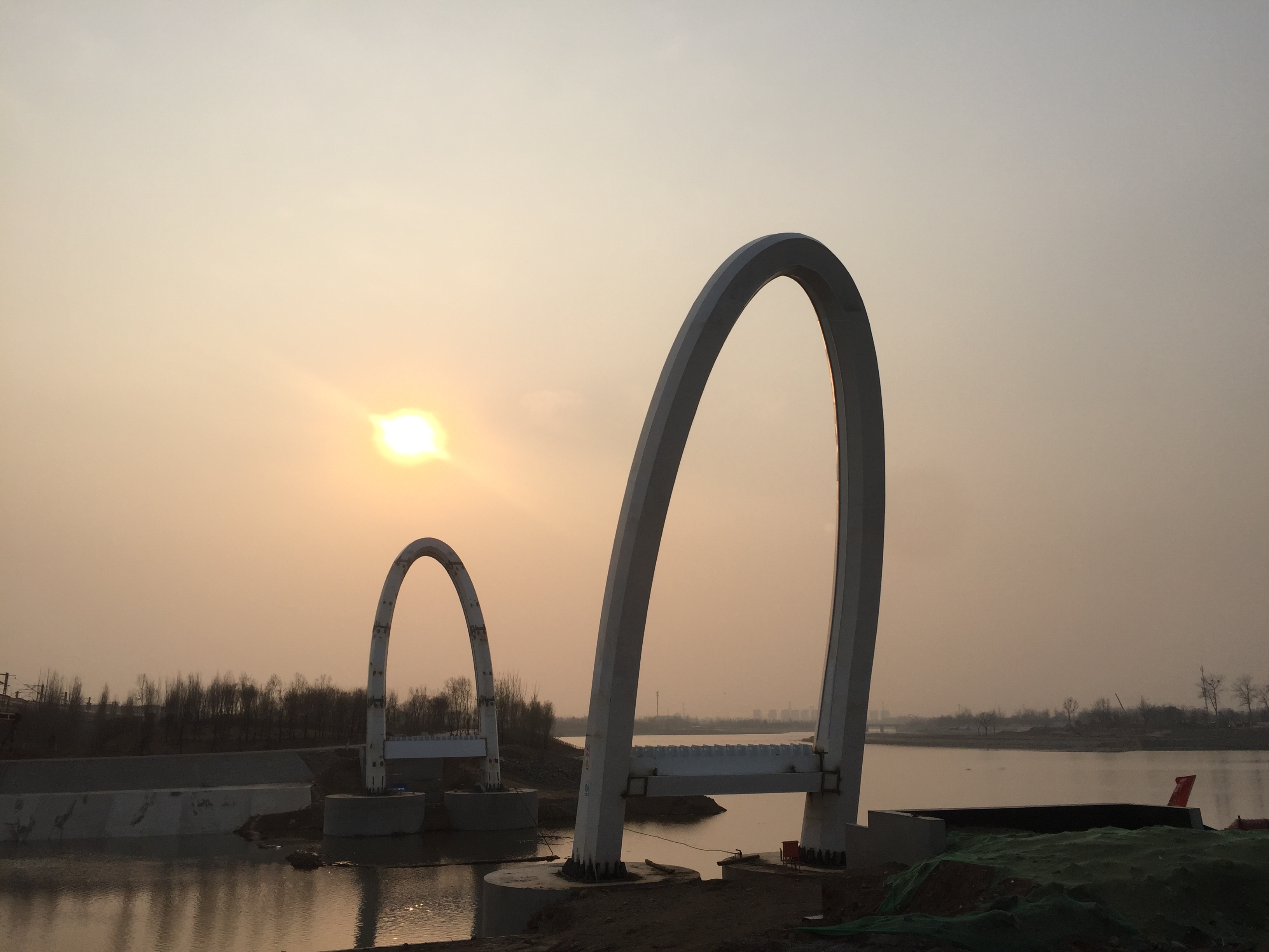 2017年4月2日,落日的余暉灑在鋼主塔上。
