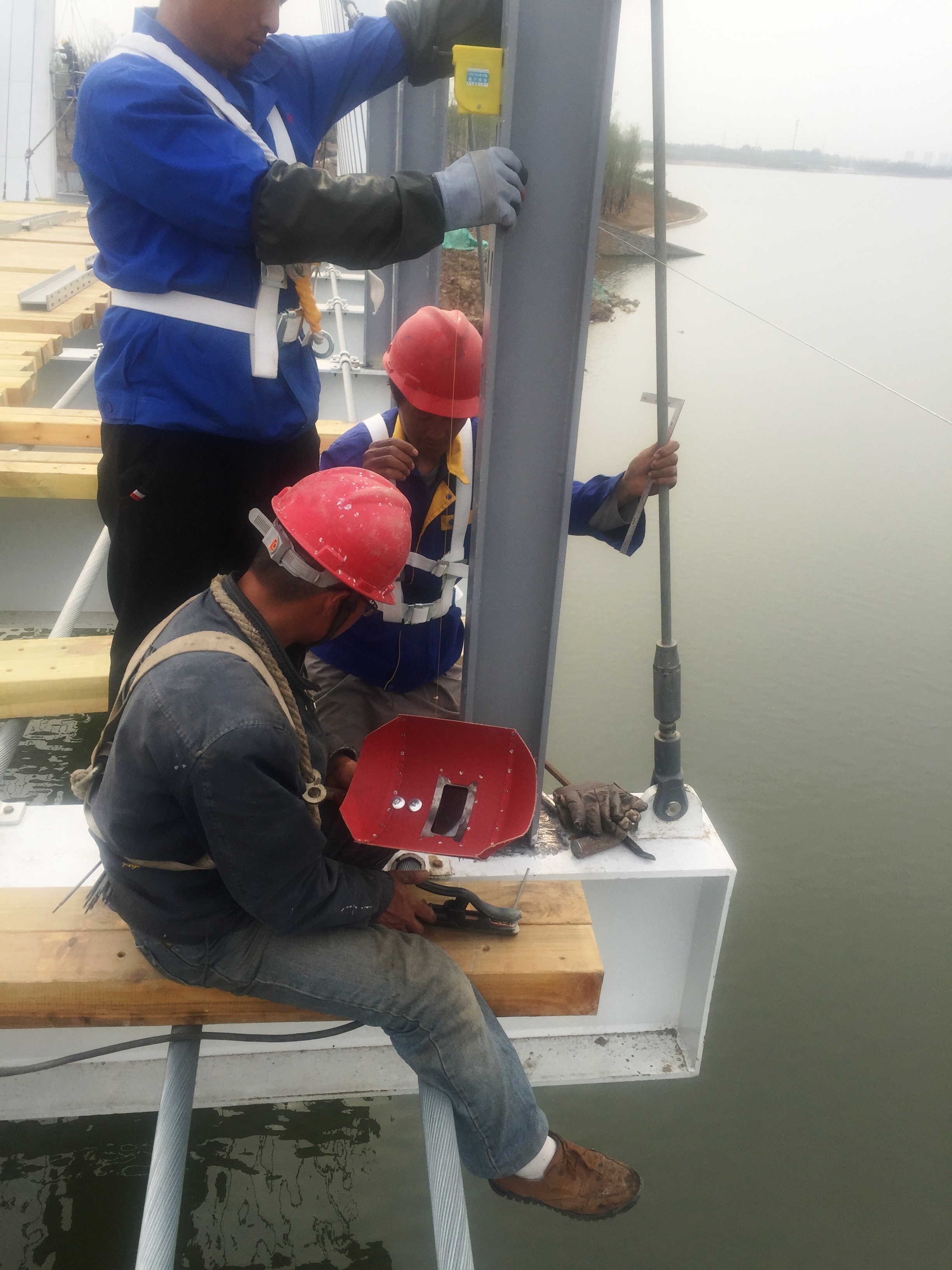 2017年4月3日,鋼主塔焊接質(zhì)量探傷。