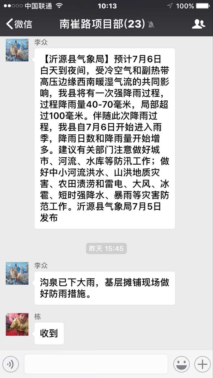 項目部負責人每天保持對天氣預報的收聽,對發(fā)生或者可能發(fā)生的突發(fā)防汛事件,及時通報,讓大家防患于未然,在出現(xiàn)緊急情況時能快速協(xié)助各施工隊做好恢復生產(chǎn)工作。