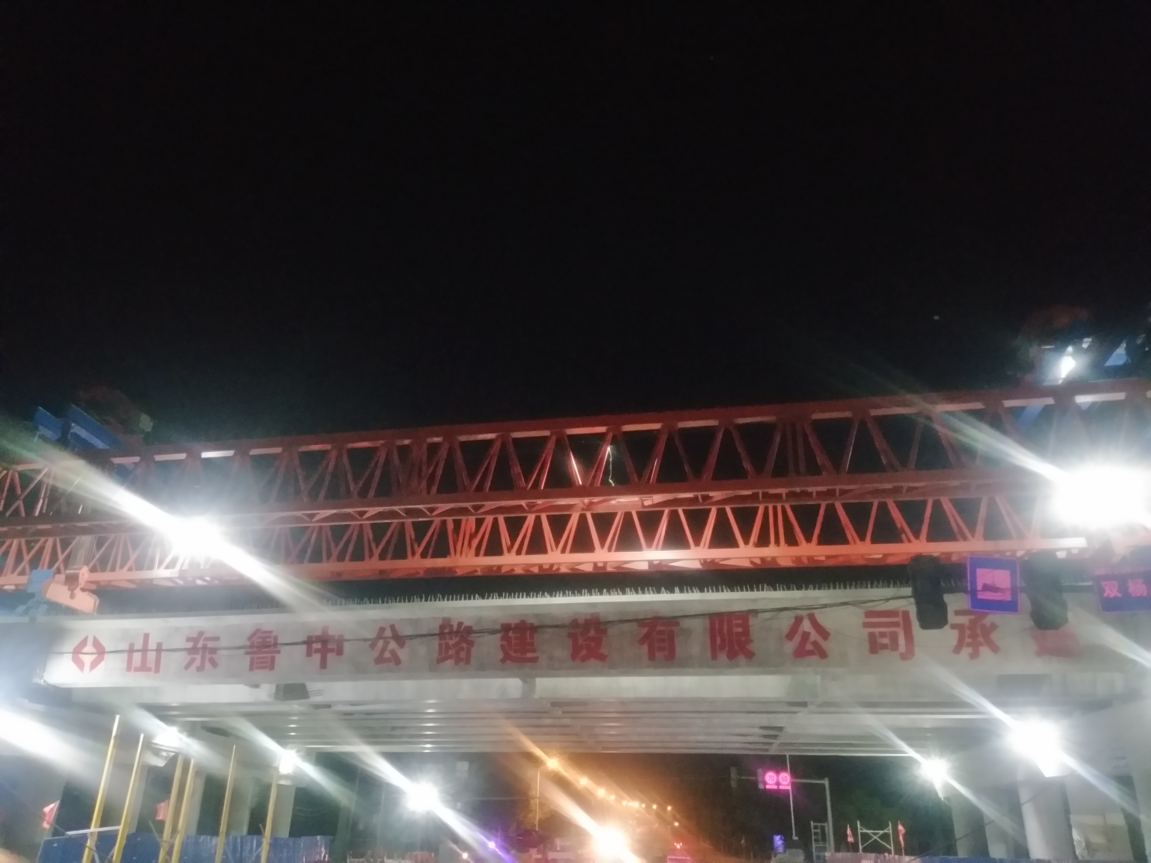 前期積極準備,制定下設施工防護大棚,車輛兩側(cè)便道分流,凌晨集中施工的方案。凌晨的夜寂靜祥和,然而張博路卻干的熱火朝天,為了不延誤工期,我們必須打起十二分的精神,順利確保十片箱梁準確無誤跨過張博路。