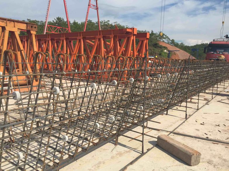 二、使用方法將胎架放置在水平的硬化場地,首先將裁好的腹板外層縱向筋擺放到胎架套筒水平定位筋上,再將加工好的腹板環(huán)形筋和底板環(huán)形筋按刻度一一擺放好并與縱向筋綁扎,然后再穿入底板縱向筋并按刻度綁扎,最后綁扎腹板內側縱向筋。上述工作全部進行完畢,經監(jiān)管工程師驗收后,將胎架兩側水平定位筋由套筒向外抽出,采用龍門吊即可將骨架吊裝至箱梁底模,接著進行下一道工序。