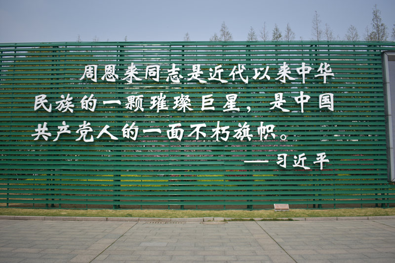 移步換景,主館后是周總理銅像,銅像總高度7.8米,寓意總理走過(guò)的78個(gè)光輝人生,其姿勢(shì)取材于周恩來(lái)與農(nóng)民親切交談時(shí)的習(xí)慣動(dòng)作——雙手叉腰、面帶微笑,顯現(xiàn)出周恩來(lái)平易近人的風(fēng)范。