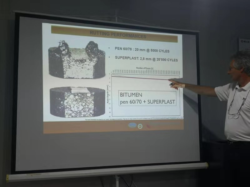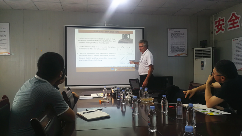 2019年7月15日意大利公路工程技術(shù)專家菲利普先生與市交通事業(yè)服務(wù)中心養(yǎng)護科,針對目前淄博重載交通、長縱坡和高溫季節(jié)等極易出現(xiàn)車轍問題,在山東魯中公路市政工程分公司進行調(diào)研與工藝學(xué)術(shù)探討。