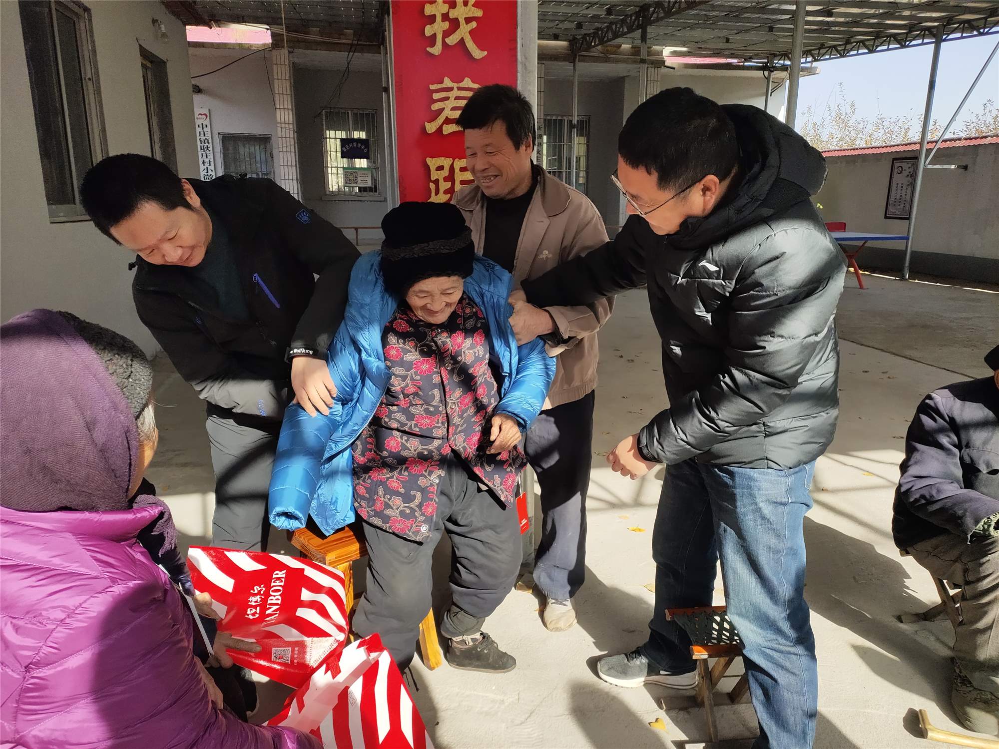 養(yǎng)護工程分公司黨支部書記黃衍剛、項目經(jīng)理王峰為村中最高壽(96歲)老人換上新衣