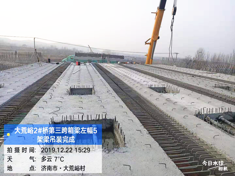 2019年12月22日9:40,在一片鞭炮歡騰中青蘭二標(biāo)大荒裕2號橋第三跨左幅外邊梁架設(shè)成功,標(biāo)志著二標(biāo)結(jié)構(gòu)物工程進入前場上部施工階段,箱梁安裝工作全面展開。