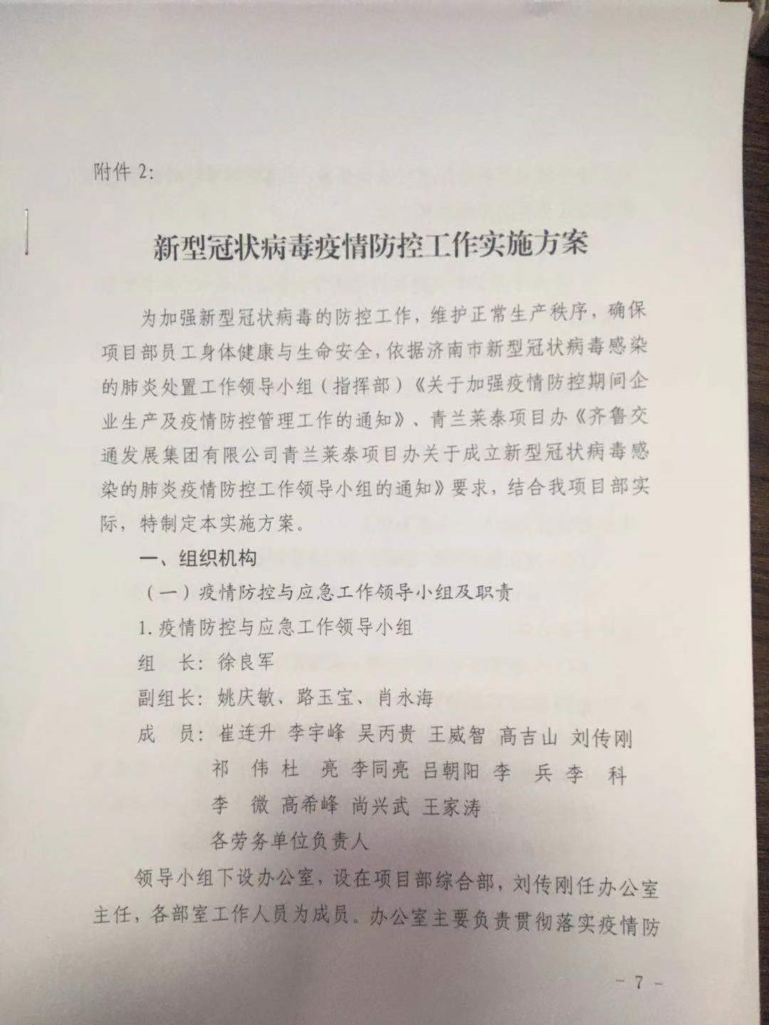 面對席卷全國的新型冠狀病毒的蔓延,青蘭項(xiàng)目全體職工不消極、不懈怠。制定方案,籌措物資,加強(qiáng)宣傳。積極貫徹落實(shí)濟(jì)南市《關(guān)于加強(qiáng)疫情防控期間企業(yè)生產(chǎn)及疫情防控管理工作的通知》、青蘭萊泰項(xiàng)目辦《關(guān)于成立新型冠狀病毒感染的肺炎疫情防控工作領(lǐng)導(dǎo)小組的通知》要求,全力以赴打好2020年復(fù)工前的攻堅(jiān)戰(zhàn)。