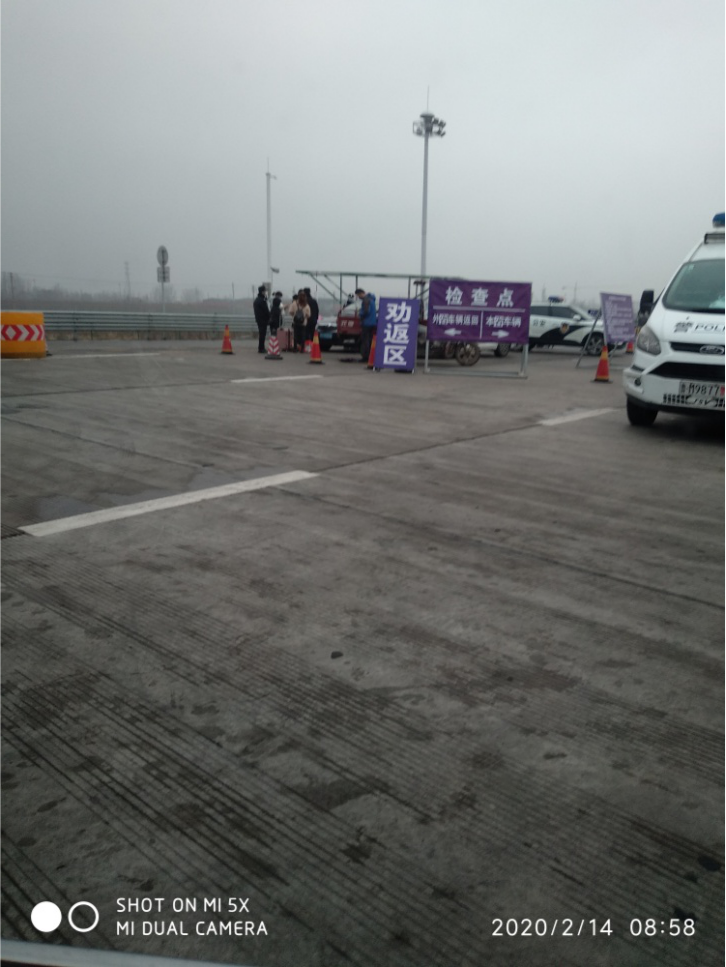 等待了一個小時二十分鐘后,看到業(yè)主拿著政府的批準(zhǔn)文件跟防疫人員交涉。此后代理和業(yè)主帶領(lǐng)我們通過收費站,進(jìn)入開標(biāo)項目所在地域。圖片中標(biāo)識牌上寫著外省車輛返回和本省車輛檢查方向指示??磥硗馐≤囕v直接返回,不讓通過。