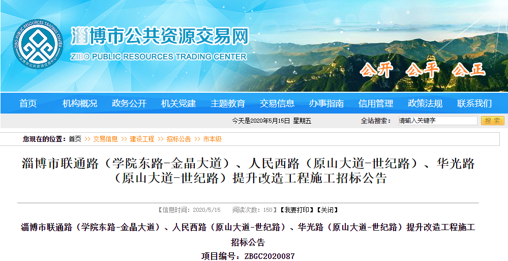 淄博市聯(lián)通路(學院東路-金晶大道)、人民西路(原山大道-世紀路)、華光路(原山大道-世紀路)提升改造工程施工招標公告