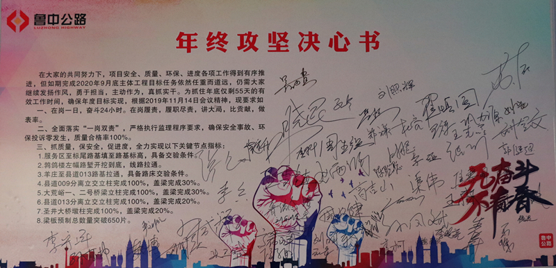 2019年11月15日,青蘭項目部全體人員拿出破釜沉舟的決心和越是艱險越向前的勇氣在《年終攻堅決心書》上莊嚴(yán)宣誓,提出“大干五十五,誓奪三億五”的攻堅目標(biāo),圓滿且超額完成2019年年度施工計劃,大幅度領(lǐng)先同線其他6個標(biāo)段,極大的鼓舞了項目部職工的戰(zhàn)斗熱情和士氣。