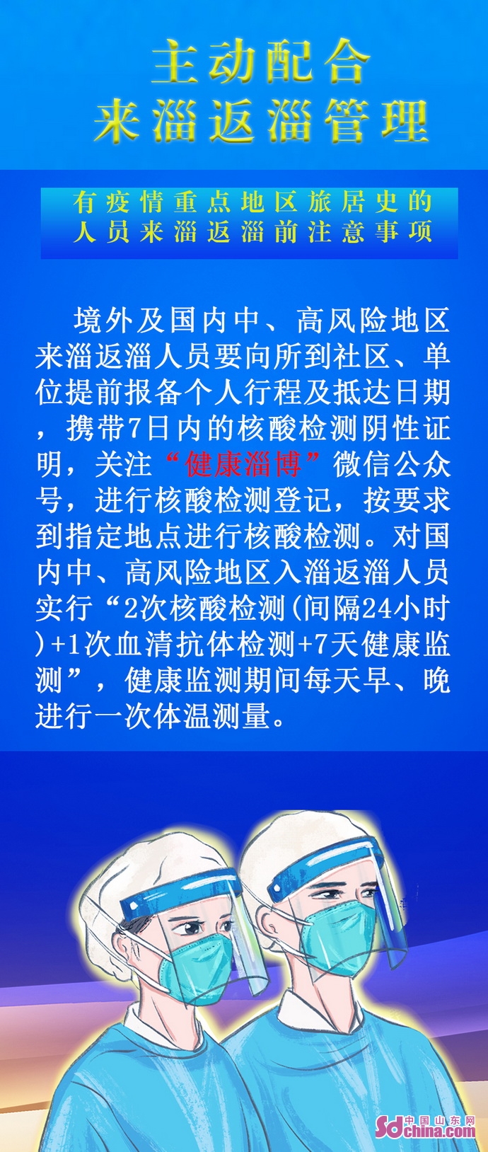 來淄返淄人員應(yīng)積極響應(yīng)疫情防控要求,境外及國內(nèi)中、高風(fēng)險(xiǎn)地區(qū)來淄返淄人員須提前向所到社區(qū)(村居)和單位如實(shí)報(bào)告行程。攜帶7日內(nèi)核酸檢測陰性證明,關(guān)注“健康淄博”公眾號,進(jìn)行核酸檢測登記,并按要求到指定地點(diǎn)進(jìn)行核酸檢測。國內(nèi)中、高風(fēng)險(xiǎn)地區(qū)來淄返淄人員務(wù)必做到“2次核酸檢測(間隔24小時(shí))+1次血清抗體檢測+7天健康監(jiān)測”,健康監(jiān)測期間配合社區(qū)(村居)人員每天早、晚監(jiān)測一次體溫。