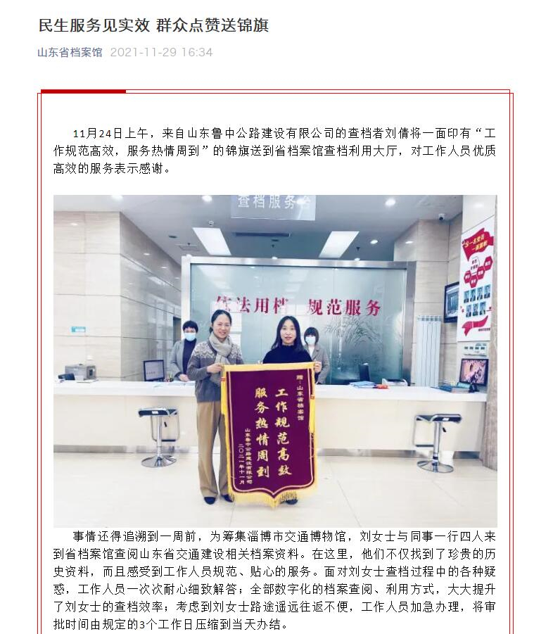 2021年11月29日,山東省檔案館公眾號推送了題為《民生服務(wù)見實(shí)效 群眾點(diǎn)贊送錦旗》的文章,講述了山東魯中公路建設(shè)有限公司為省檔案館送上錦旗的故事。