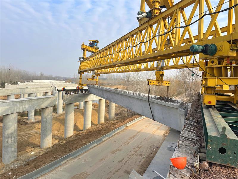 白馬河大橋全長219.5米,橋梁上部結(jié)構(gòu)采用30m裝配式預(yù)應(yīng)力混凝土連續(xù)箱梁,共七跨,一跨12片共計84片。經(jīng)過項目人員的共同努力,白馬河大橋橋梁下部結(jié)構(gòu)已于21年年底完工。復(fù)工伊始,項目部就及時協(xié)調(diào)架橋機進場、安裝、調(diào)試,準備進行架設(shè)工作。在人力、物力、機械、計劃等方面項目部可是做足了功夫,結(jié)合施工實際情況及時與業(yè)主監(jiān)理方面對接進行方案調(diào)整;組織好人員抓好對梁板預(yù)制、儲存、運輸?shù)拳h(huán)節(jié)的細節(jié)把控;聯(lián)系地方交通管制部門,規(guī)劃運梁路線;協(xié)調(diào)監(jiān)理及施工隊伍進行梁板架設(shè)前的安全技術(shù)交底;安全隊伍在沿線增設(shè)警示標志,警示過往行人及車輛?,F(xiàn)場支座安裝完成后,梁板進入架橋機準備進行架設(shè),架設(shè)檢查合格完成后進行臨時加固,報監(jiān)理工程師檢查,監(jiān)理工程師檢查完成后方可進行下一片梁板的吊裝架設(shè)。整個過程緊張而有序的進行著,項目部盡早準備、精心組織、有序協(xié)作的工作方式贏得了業(yè)主及監(jiān)理單位的一致好評。