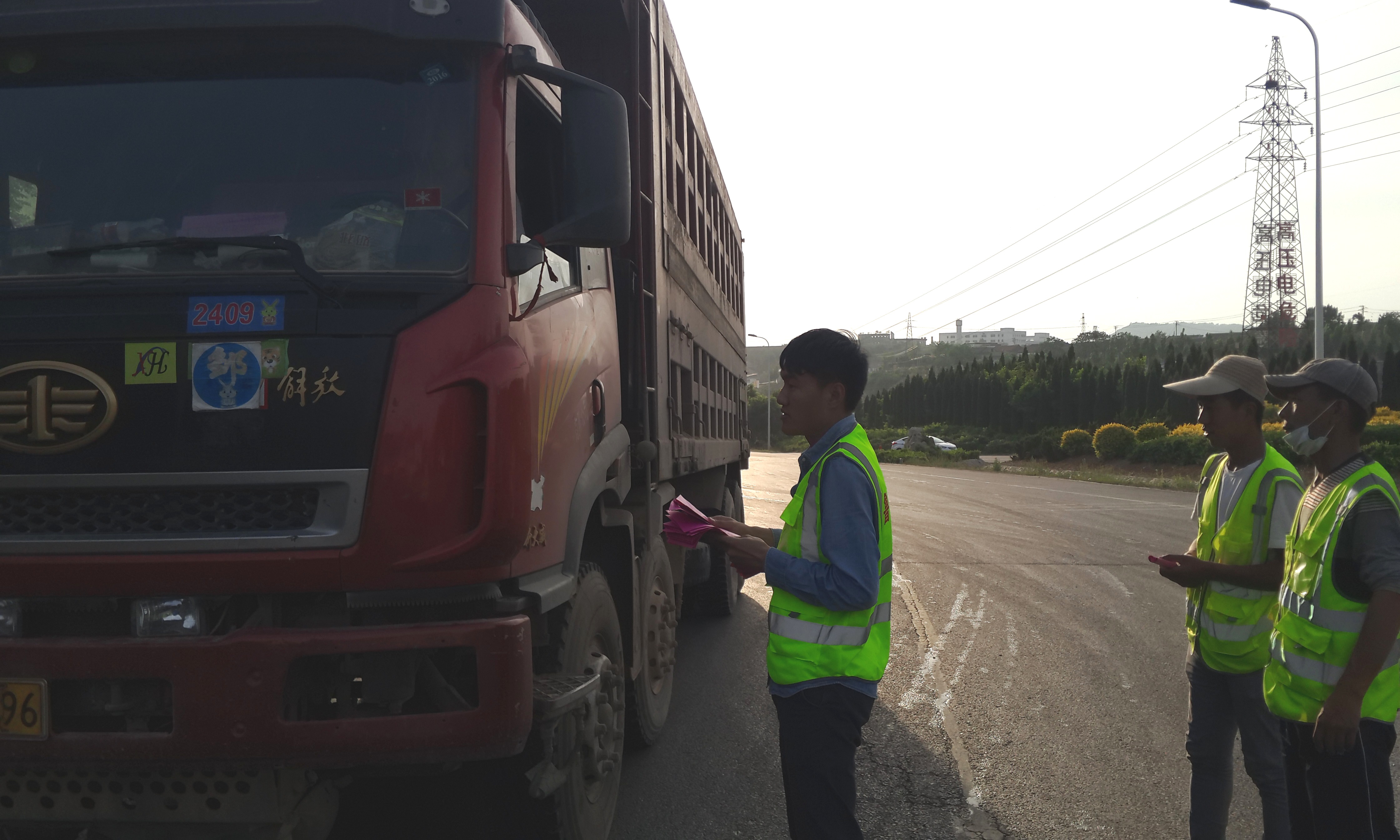 施工員向過往車輛發(fā)放傳單,告知博沂路封閉施工。