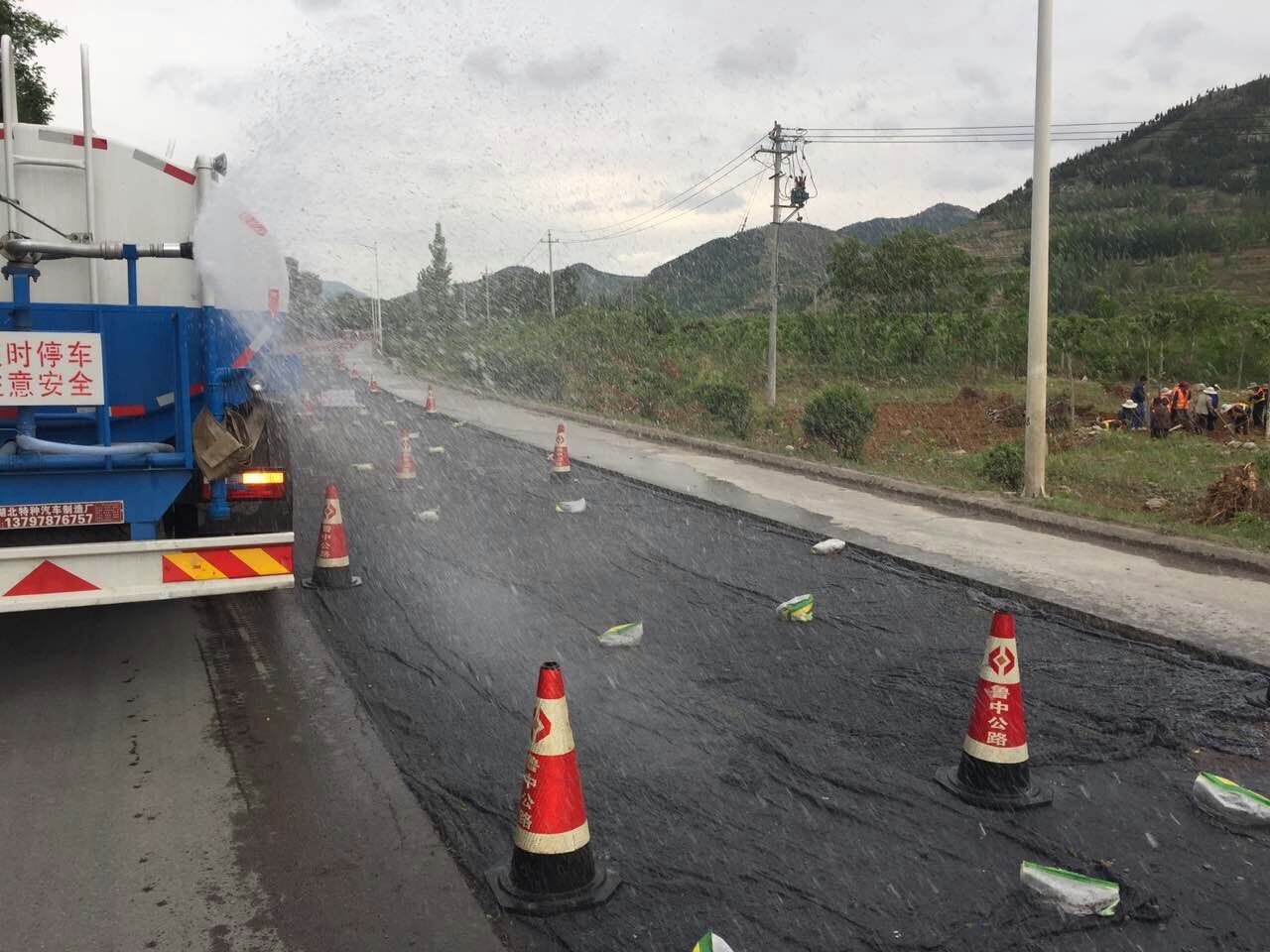 中修段基層覆蓋雙層養(yǎng)生毯并側(cè)噴灑水養(yǎng)生。