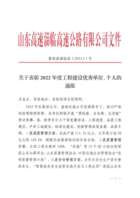 近日,山東高速淄臨高速公路有限公司發(fā)布魯高速淄臨綜【2023】1號——《關(guān)于表彰2022年度工程建設(shè)優(yōu)秀單位、個人的通報》,魯中公路臨臨項目六合同獲評“優(yōu)秀施工單位”等多項表彰。