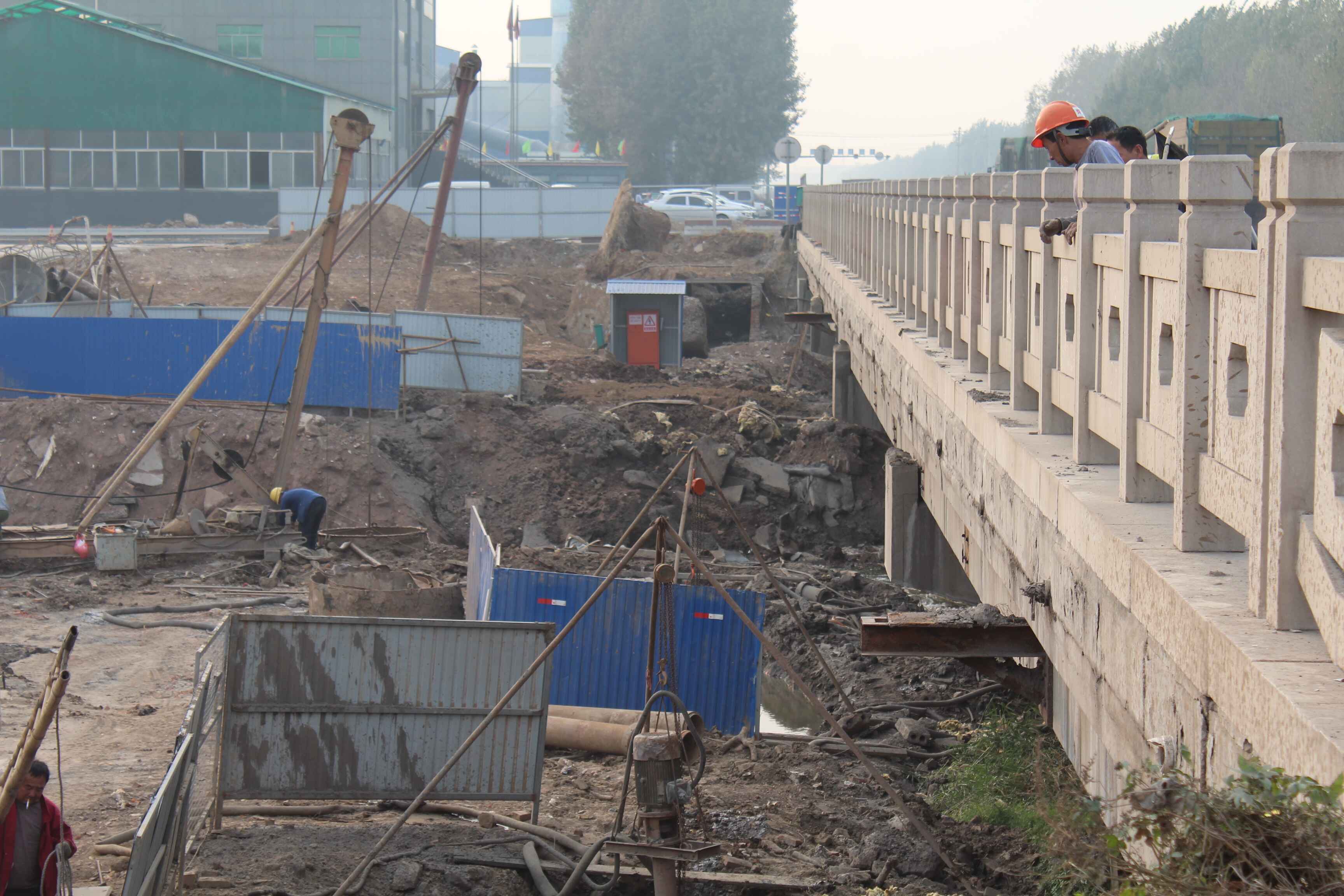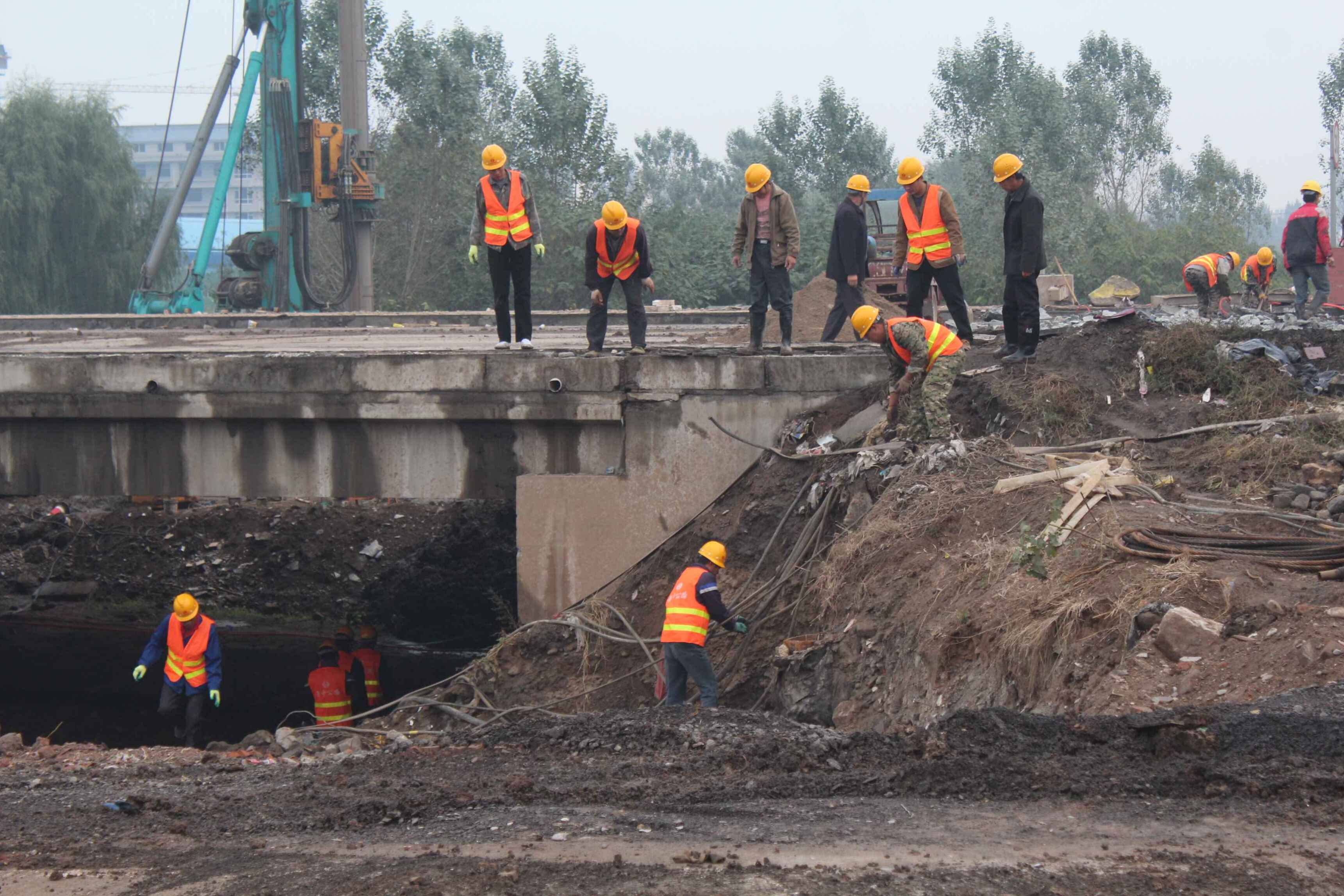 經(jīng)過前期的準備工作,現(xiàn)拆除趙瓦危橋的工作進入拆除橋體主體結(jié)構(gòu)的階段。上午7時,省道S102濟青線路面中大橋工程二標項目部在趙瓦村孝婦河橋頭召開技術(shù)安全交底會,對趙瓦孝婦河橋拆除工作進行現(xiàn)場交底。15點58分,通過現(xiàn)場交底工作,發(fā)現(xiàn)準備工作中尚存在不足之處,經(jīng)過分析和補充,在安全防范工作進一步加強后,拆除工作在水炮抑塵的配合下展開混凝土構(gòu)件破拆作業(yè)。