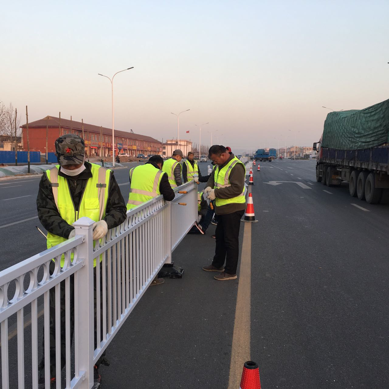 昌國路東段拓寬改造交通設(shè)施--道路中央隔離欄正在進(jìn)行施工作業(yè)